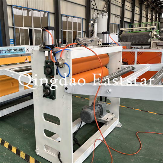 Sprzęt do mat antypoślizgowych z PCV Maszyna do miękkich arkuszy: Sprzęt składa się głównie z wytłaczarki jednoślimakowej, kalandra trójwalcowego, 6-metrowego wspornika chłodzącego, maszyny do trakcji wałków gumowych, nożyc i urządzenia przenośnika taśmowego.