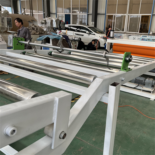 Sprzęt do antystatycznej płyty PCV: Sprzęt składa się głównie z wytłaczarki jednoślimakowej 120, kalandra trójwalcowego, wspornika chłodzącego, maszyny do trakcji z gumowymi wałkami, maszyny do cięcia i