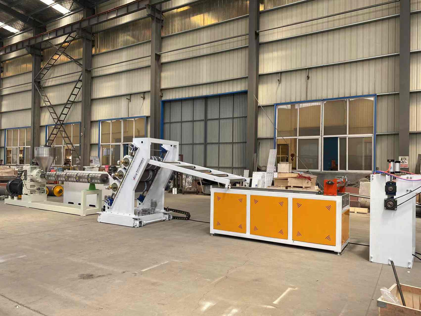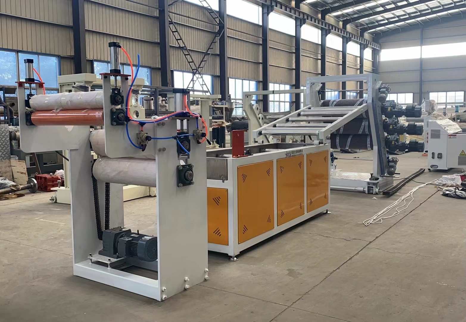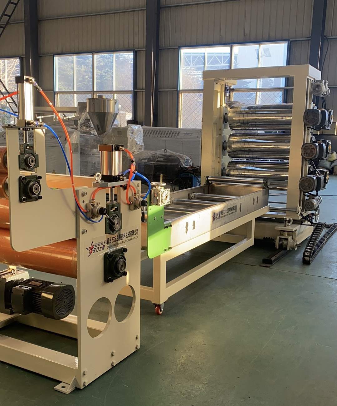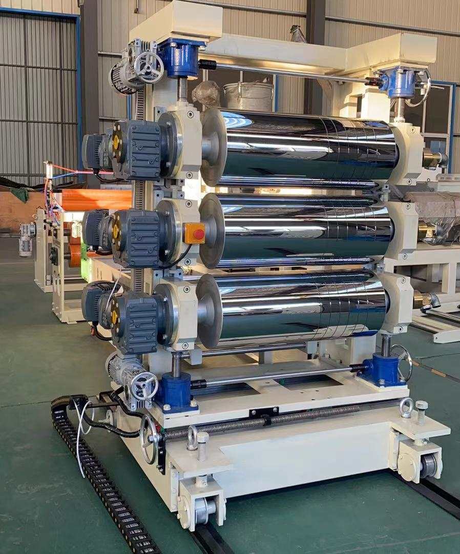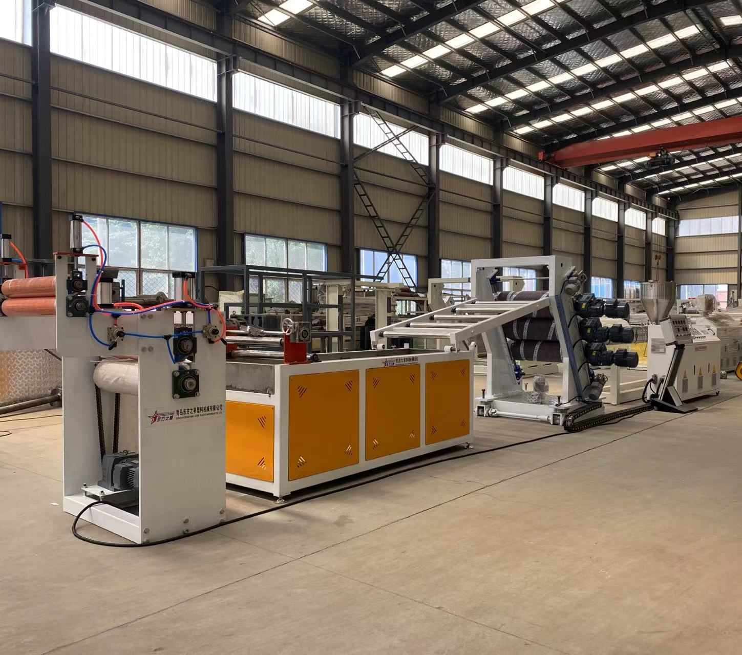 Linia do produkcji przezroczystych miękkich zasłon drzwiowych z PCV: Możliwość produkcji przezroczystych arkuszy z tworzywa sztucznego PCV o szerokości od 200 do 600 milimetrów i grubości od 0,8 do 3 milimetrów. Wyposażenie obejmuje wytłaczarkę jednoślimakową SJ90 lub SJ-120, regulowaną elastyczną matrycę w kształcie litery T, trójwalcowy kalandr o nachyleniu pionowym lub 45 stopni, regulator temperatury wody „trzy w jednym”, wspornik chłodzący ze stali nierdzewnej wyposażony w nóż do przycinania o regulowanej szerokości, gumową maszynę ciągnącą rolkę oraz dwupozycyjną nawijarkę wału rozprężającego się powietrzem. Wytwarzane arkusze charakteryzują się błyszczącą powierzchnią, dużą przezroczystością, miękkością, brakiem pęknięć, nieprzyjemnym zapachem, pęcherzykami powietrza, są elastyczne, odporne na zimno, ścieranie, kwaso-zasadowe i odporne na korozję.